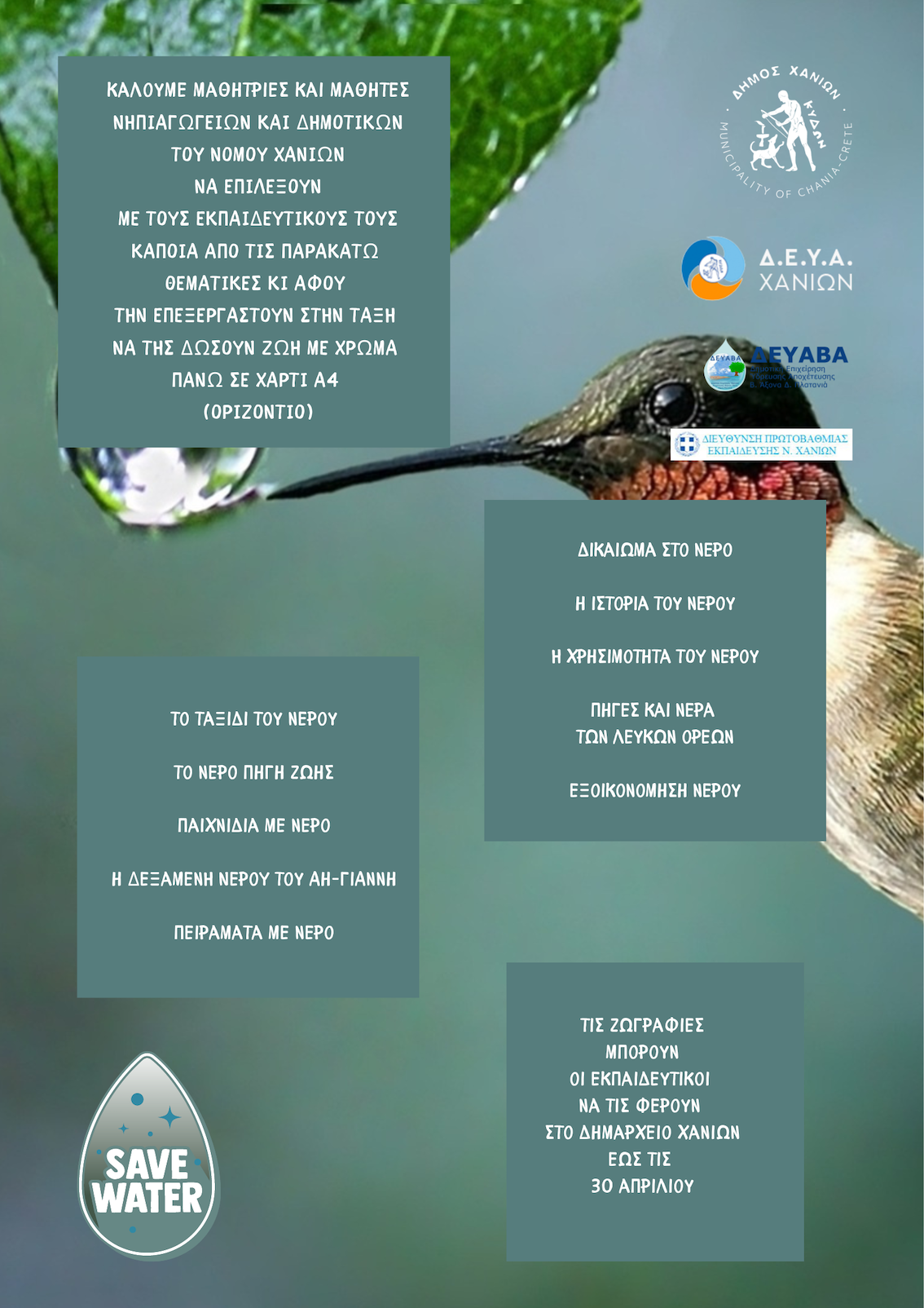 Οι συμμετέχοντες με την πολύτιμη βοήθεια των εκπαιδευτικών τους καλούνται να δημιουργήσουν έργα ζωγραφικής με θέμα το νερό, τα οποία μπορούν να παραδώσουν στο Δημαρχείο Χανίων έως τις 30 Απριλίου 2023.