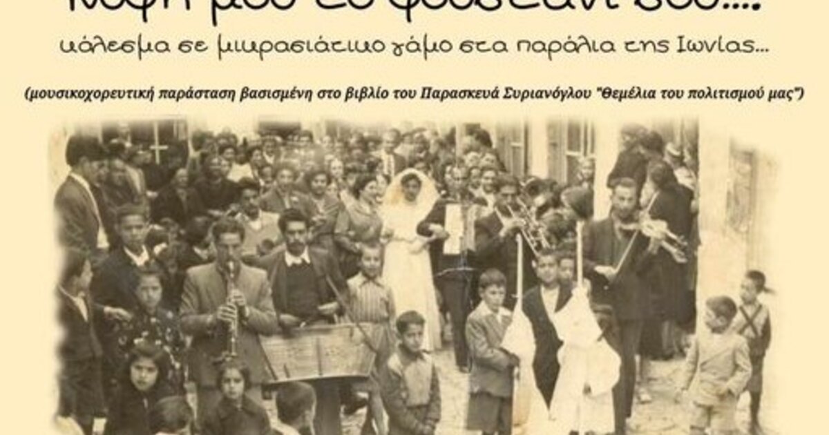 Η εκδήλωση με τίτλο «Νύφη μου το φουστάνι σου…» είναι βασισμένη στο βιβλίο του Παρασκευά Συριανόγλου «Θεμέλια του πολιτισμού μας» και μας μεταφέρει στα παράλια της Ιωνίας του περασμένου αιώνα, αναδεικνύοντας ήθη, έθιμα, τραγούδια και χορούς του γάμου.