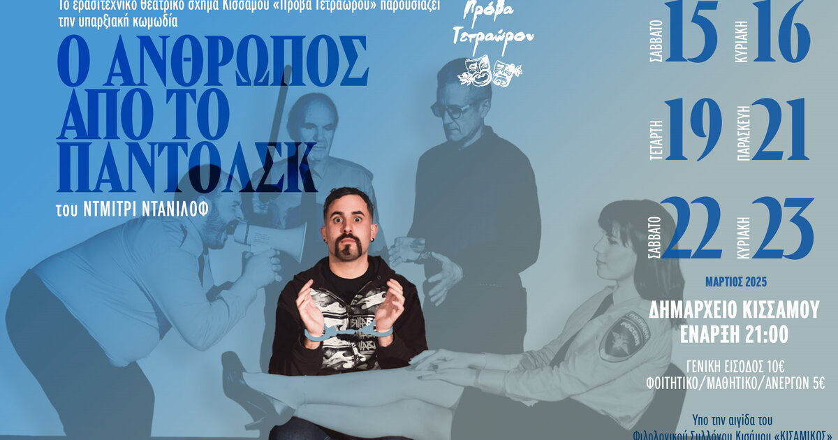 Οι παραστάσεις θα δοθούν στην αίθουσα εκδηλώσεων του Δήμου Κισσάμου, ώρα 9:00 το βράδυ, στις 15, 16, 19, 21, 22, 23 Μαρτίου.