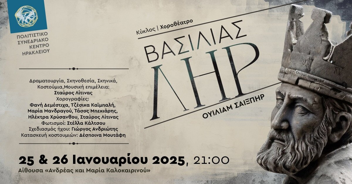 Ο καταξιωμένος χορογράφος και σκηνοθέτης Σταύρος Λίτινας καταθέτει τον Ιανουάριο στο Πολιτιστικό Συνεδριακό Κέντρο Ηρακλείου, για δύο μόνο παραστάσεις, την προσωπική του σύλληψη πάνω στο αριστούργημα του Ουίλιαμ Σαίξπηρ Βασιλιάς Ληρ, βασισμένη στον χορό και την εικαστικότητα.