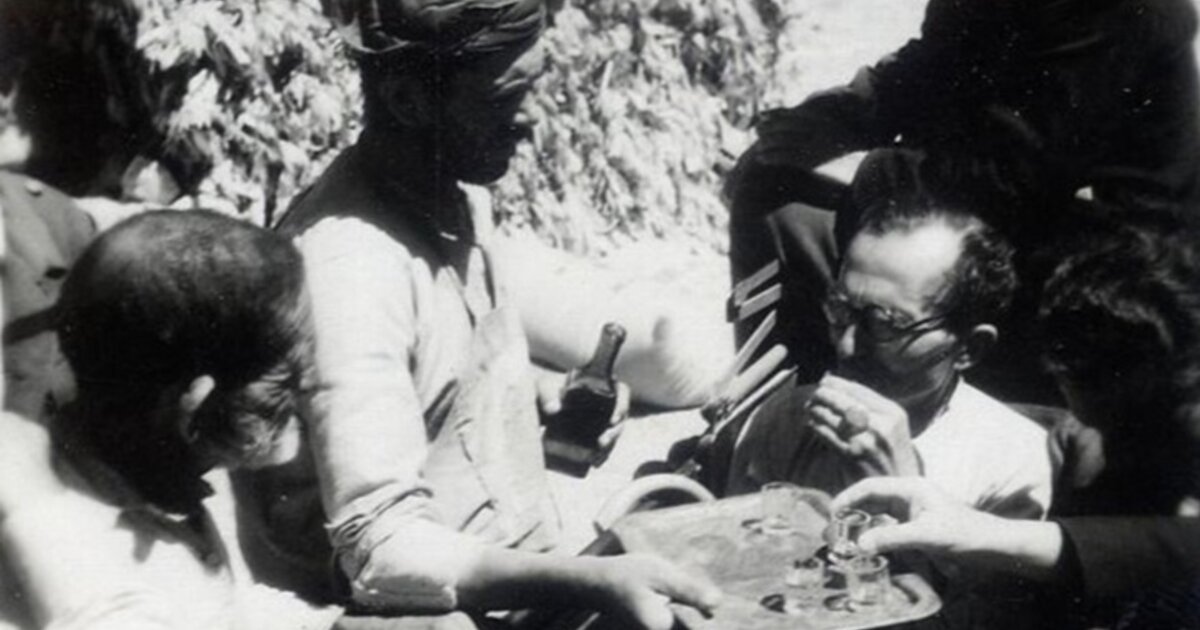 Ο Νίκος Καζαντζάκης επισκέφθηκε τα Ανώγεια τον Ιούλιο του 1945, έναν χρόνο μετά το Ολοκαύτωμα, ως μέλος της Κεντρικής Επιτροπής Διαπιστώσεως