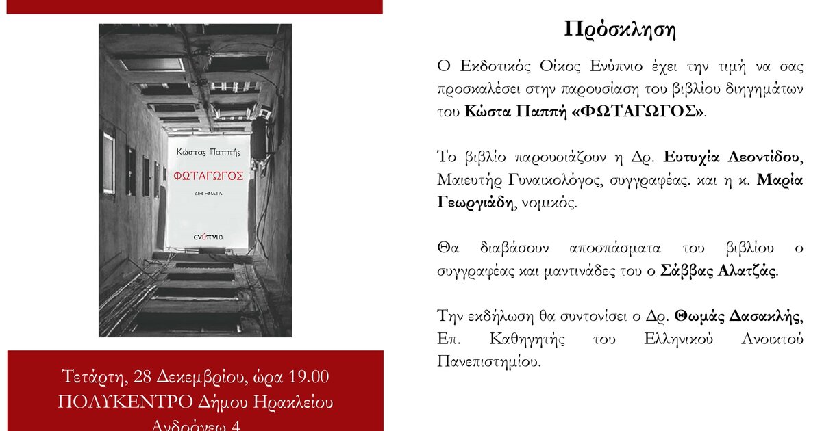 Το βιβλίο του «ΦΩΤΑΓΩΓΟΣ», με βιωματικά στοιχεία του συγγραφέα από την Κρήτη, θα παρουσιάσει ο Κώστας Παππής, Ομότιμος Καθηγητής του Πανεπιστημίου Πειραιά, στο Πολύκεντρο του Δήμου Ηρακλείου την Τετάρτη 28 Δεκεμβρίου, ώρα 19:00.