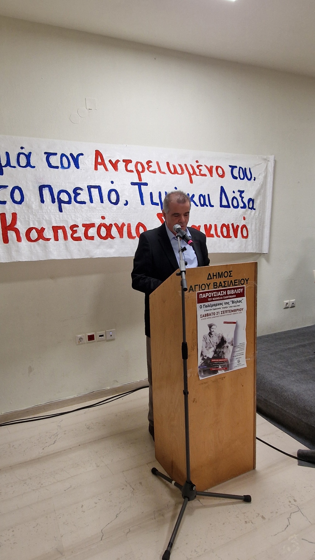 Δυο κουβέντες από καρδιάς θέλησε να πει, έστω και εξ αποστάσεως ο Θοδωρής Βλαχάκης, μουσικός και ιδρυτικό μέλος του ροκ συγκροτήματος Magic De Spell. Η επιστολή του αναγνώστηκε από τη συντονίστρια της εκδήλωσης: “Είχα την τιμή να γράψω ένα μικρό εισαγωγικό σημείωμα για το βιβλίο. Τα βιβλία του Μανώλη Παντινάκη, είναι εγχειρίδια γνώσης και αφύπνισης. Διασώζουν μαρτυρίες που σε διαφορετική περίπτωση θα είχαν χαθεί για πάντα. Αποτελούν ένα αντίδοτο, απέναντι στη γοητεία του «Θαυμαστού Καινούργιου Κόσμου» του Άλντους Χάξλεϋ. Ο Γιώργης Αρετάκης, ο καπετάν Σφακιανός, ο δικός μας Άρης Βελουχιώτης, επιστρέφει στον τόπο του. Ζωντανεύουν οι μνήμες όσων αγωνίστηκαν για την ελευθερία και φέρνουν στο μυαλό μου στίχους ενός αγαπημένου μουσικού συγκροτήματος, των Κοινών Θνητών: «Σ’ αυτή τη μηχανή, του κόσμου οι λαοί, αντί για λάδι καίνε ανθρώπου αίμα».