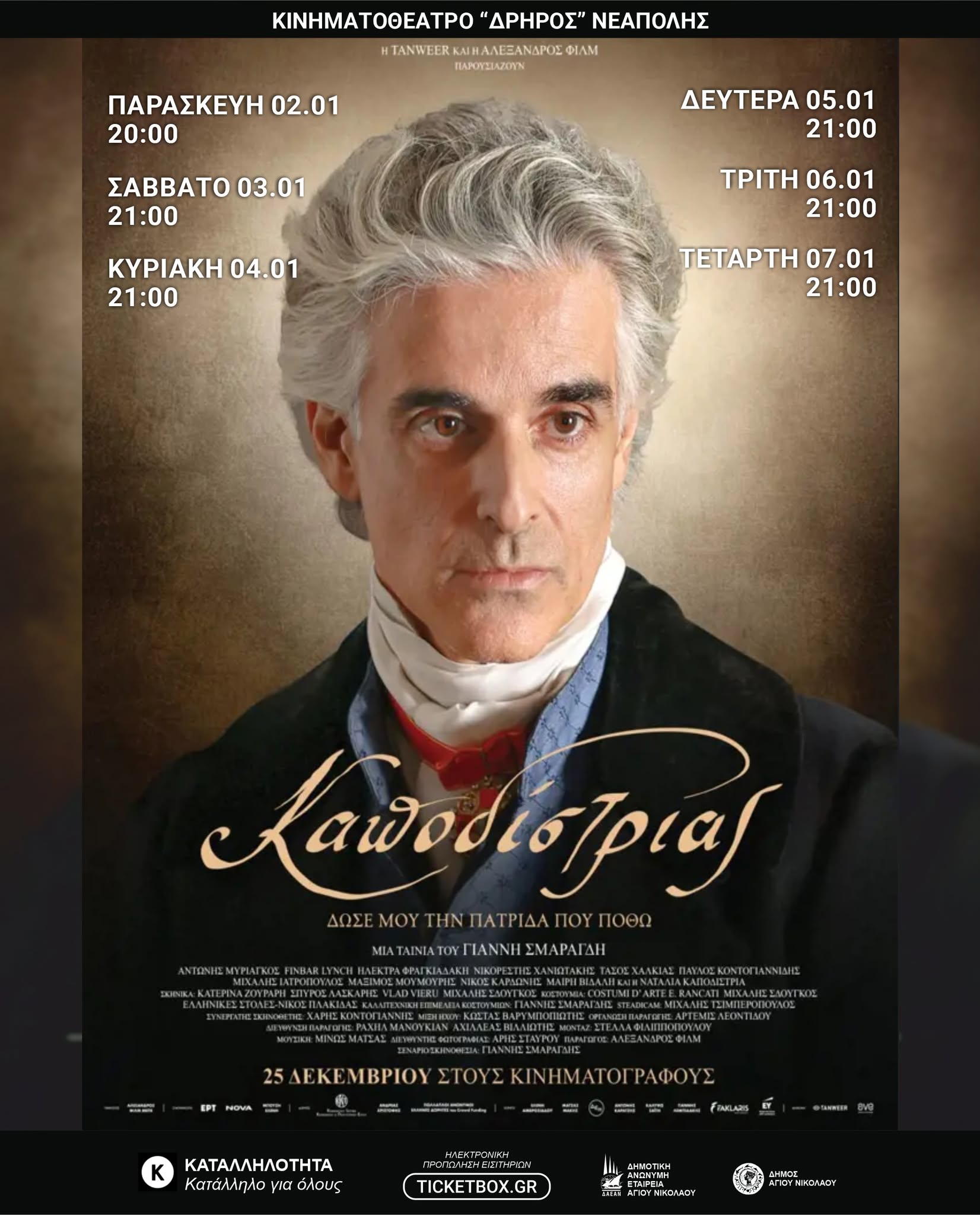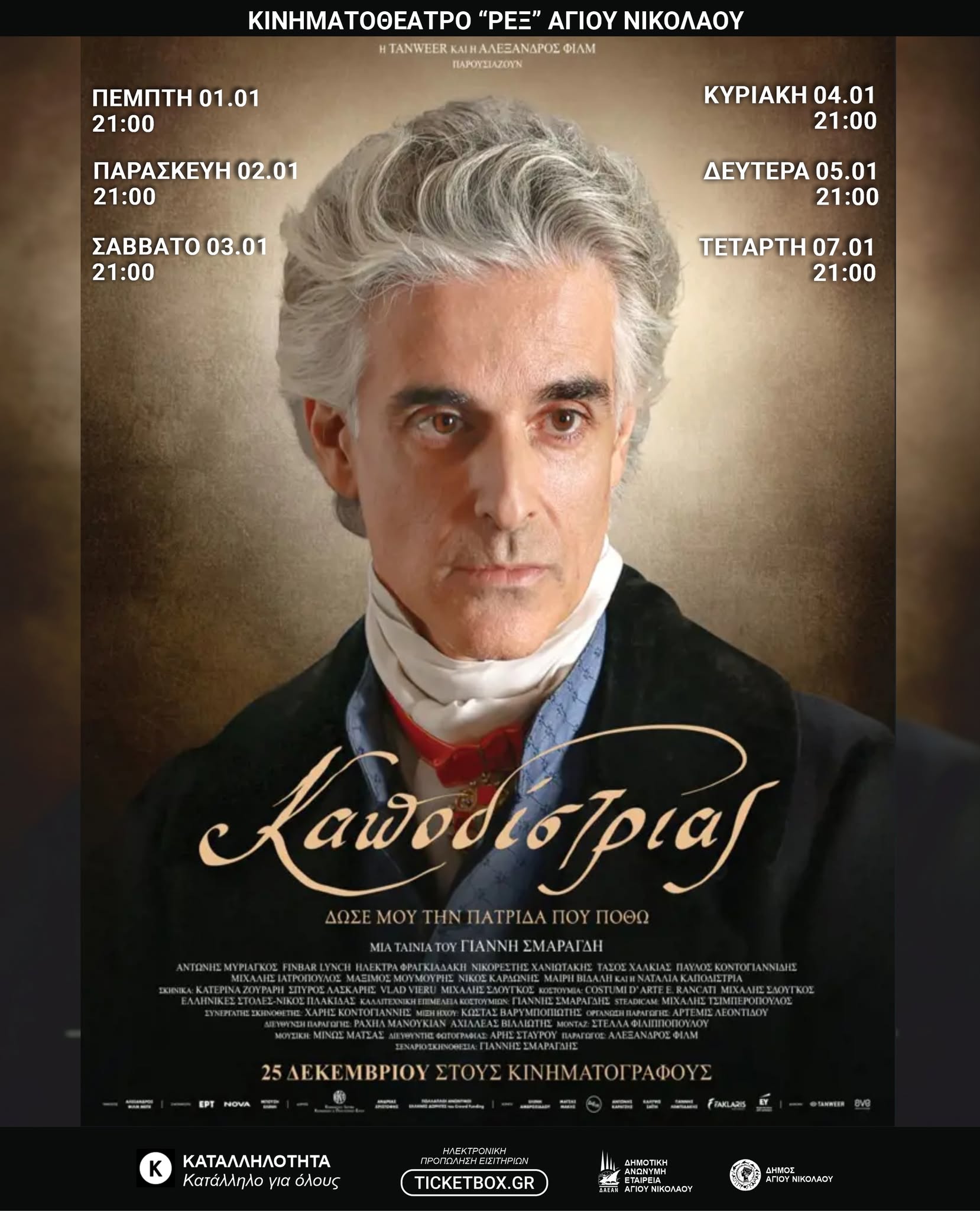 Με την πολυαναμενόμενη ταινία του Γιάννη Σμαραγδή “Καποδίστριας” και τις ταινίες "ΑΠΟΣΤΟΛΗ ΑΓΙΟΣ ΒΑΣΙΛΗΣ” και “8½” συνεχίζονται οι προβολές στα Κινηματοθέατρα «REX» στον Άγιο Νικόλαο και «Δρήρος» στη Νεάπολη.