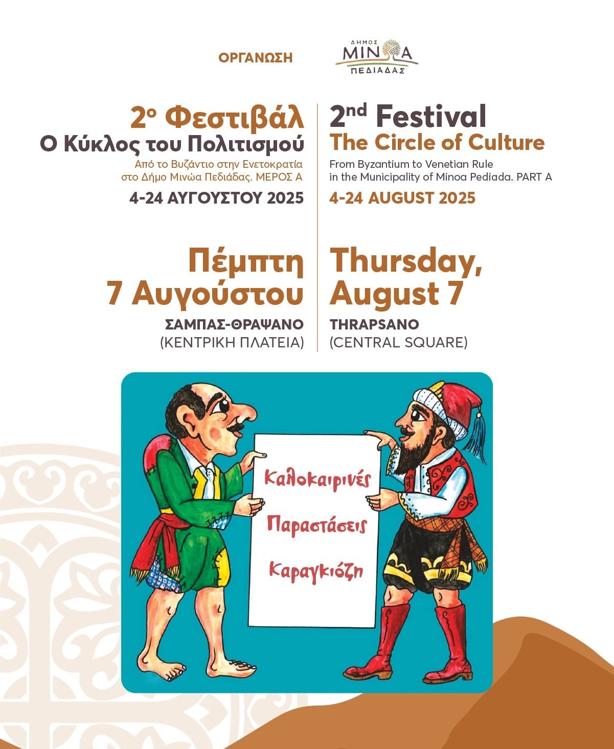 21:00: Παράσταση Καραγκιόζη από το Θέατρο Σκιών Κρήτης, που θα διασκεδάσει μικρούς και μεγάλους.