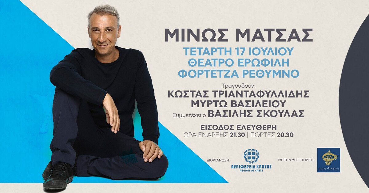 Ο βραβευμένος συνθέτης Μίνως Μάτσας έρχεται στις 17 Ιουλίου 2024 για μια μοναδική συναυλία στο Δημοτικό Θέατρο Ερωφίλη στο Ρέθυμνο, σε διοργάνωση της Περιφέρειας Κρήτης και με την υποστήριξη του Δήμου Ρεθύμνης.