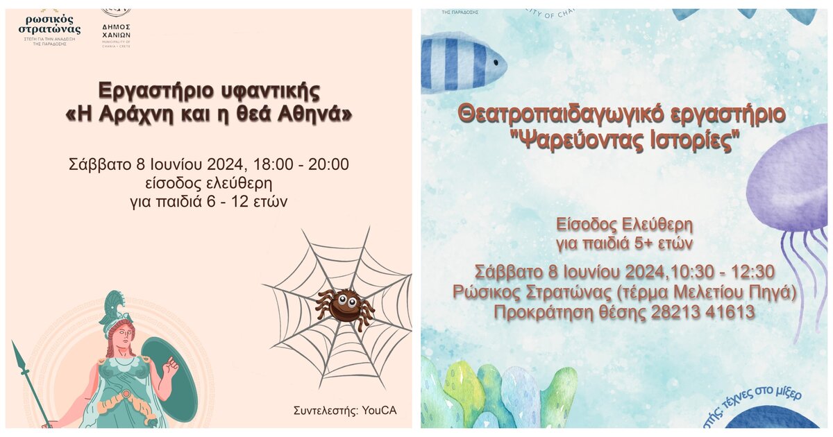 Έτσι, το Σάββατο 8 Ιουνίου 2024 στον Ρωσικό Στρατώνα του Δήμου Χανίων, στις 10:30 π.μ. τα παιδιά θα έχουν την ευκαιρία να παρακολουθήσουν το θεατροπαιδαγωγικό πρόγραμμα “Ψαρεύοντας Ιστορίες” και να μάθουν περισσότερα σχετικά με το επάγγελμα του ψαρά. Το πρόγραμμα περιλαμβάνει αφηγήσεις λαϊκών και κλασικών ιστοριών, μύθων και θρύλων, εικαστική κατασκευή ψαριών και πολλές κινητικές και θεατρικές δραστηριότητες.