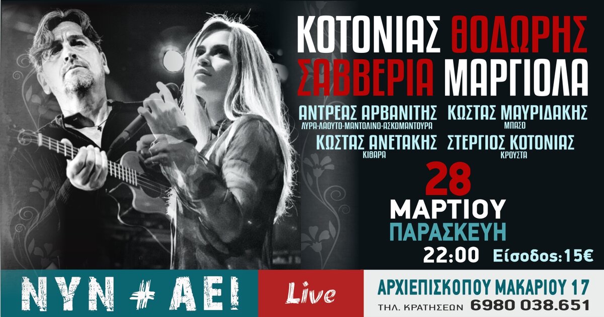 Δύο γνωστοί και αγαπημένοι καλλιτέχνες στο κοινό για το ταλέντο και το ήθος τους, ο τραγουδοποιός - τραγουδιστής Θοδωρής Κοτονιάς και η εξαιρετική ερμηνεύτρια Σαββέρια Μαργιολά έρχονται στο Ηράκλειο στην σκηνή του ΝΥΝ & ΑΕΙ για μία μοναδική βραδιά!