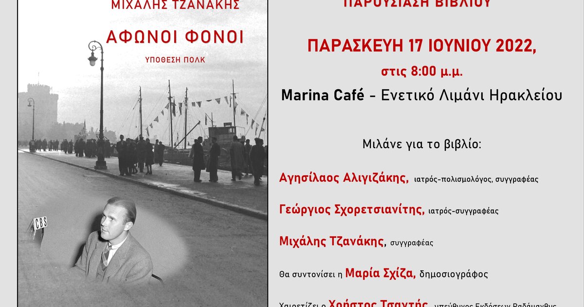 Οι Εκδόσεις Ραδάμανθυς παρουσιάζουν το ιστορικό μυθιστόρημα «Άφωνοι Φόνοι – Υπόθεση Πολκ» του Μιχάλη Τζανάκη, την Παρασκευή 17 Ιουνίου 2022 στις 8 το απόγευμα, στο Μαρίνα Καφέ, στο Ενετικό Λιμάνι του Ηρακλείου.