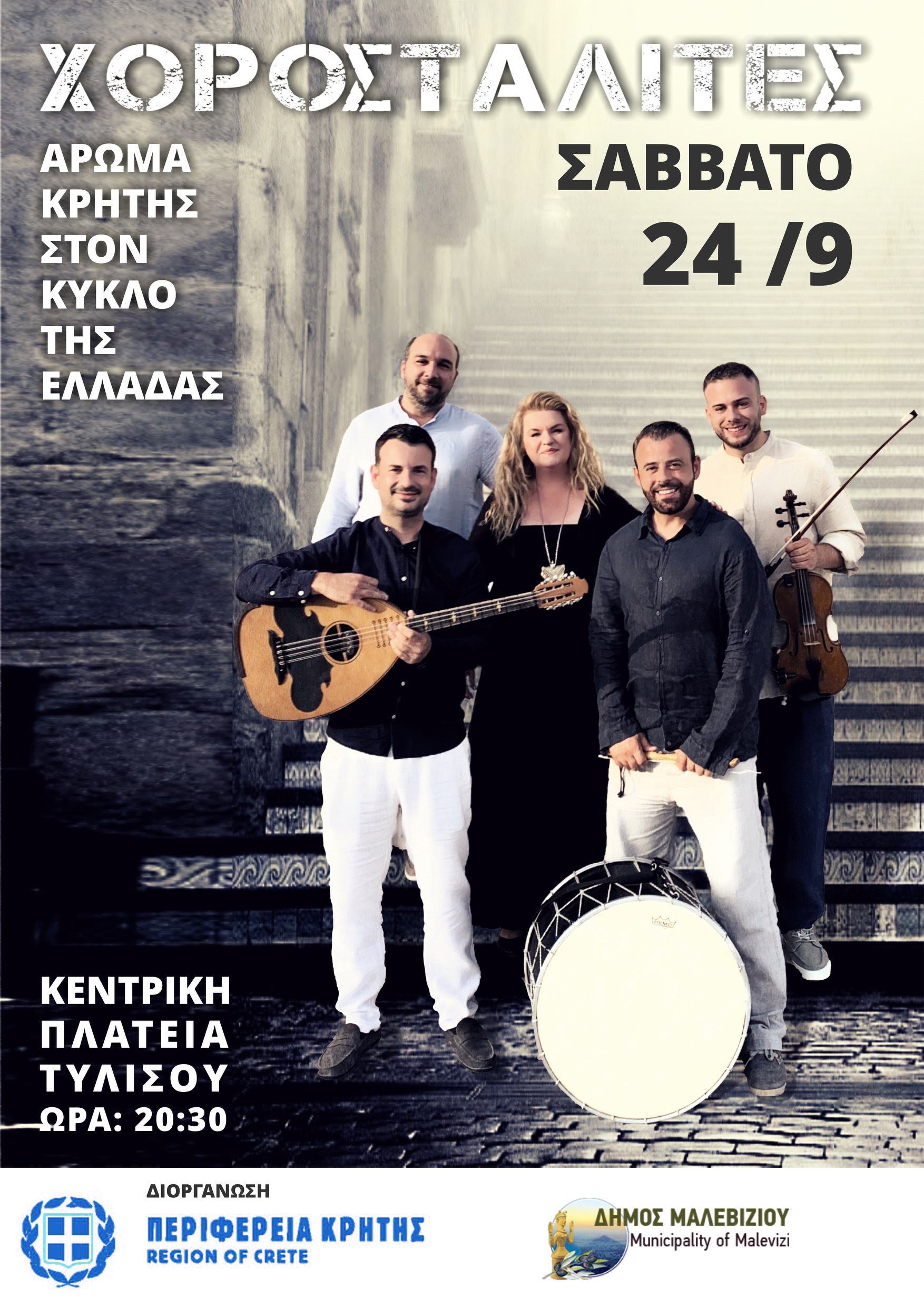 Oι «Χοροσταλίτες» παρουσιάζουν το Σάββατο 24 Σεπτεμβρίου και ώρα 8:30 μ.μ. την νέα τους συναυλία στην Τύλισο Ηρακλείου με τίτλο «Άρωμα Κρήτης στον κύκλο της Έλλαδας» με τη διοργάνωση της Περιφέρειας Κρήτης και με ελεύθερη είσοδο και στήριξη από το Δήμο Μαλεβιζίου.
