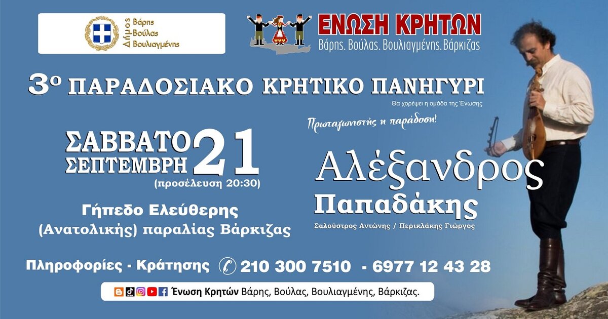 Η Ένωση Κρητών Βάρης, Βούλας, Βουλιαγμένης, Βάρκιζας και ο Δήμος Βάρης Βούλας Βουλιαγμένης διοργανώνουν το 3ο Παραδοσιακό Κρητικό Πανηγύρι στο γήπεδο ελεύθερης (Ανατολικης) παραλίας Βάρκιζας, το Σάββατο 21 Σεπτεμβρίου στις 20:30 το βράδυ.