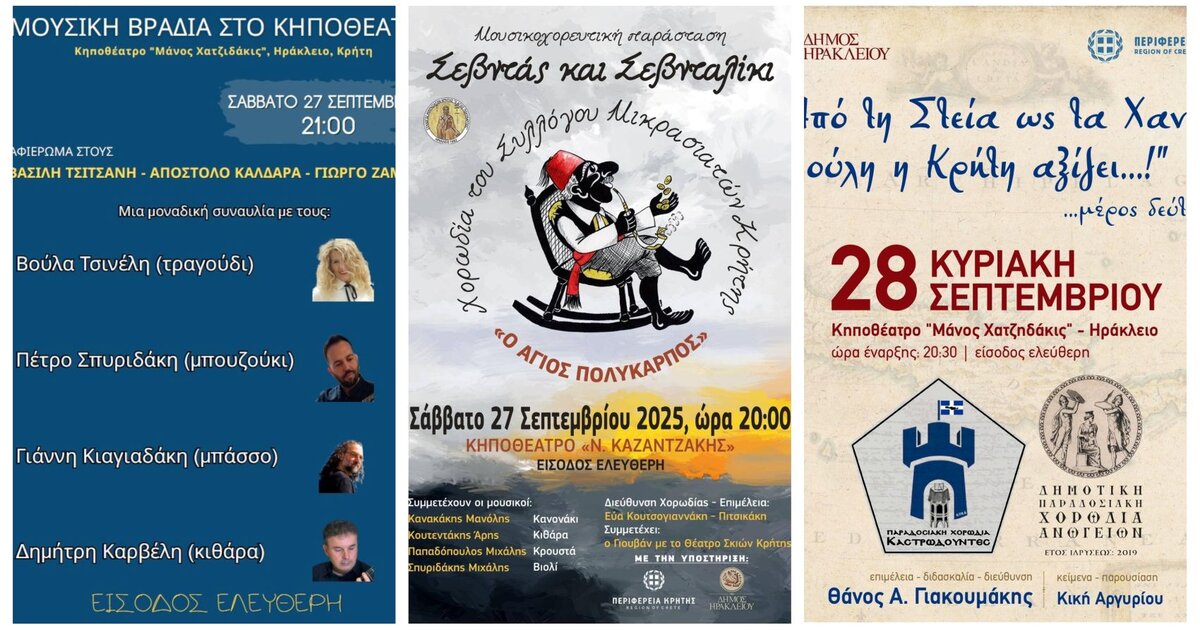 Δείτε αναλυτικά το πρόγραμμα των εκδηλώσεων του Δήμου Ηρακλείου εδώ: https://www.heraklionculture.gr/