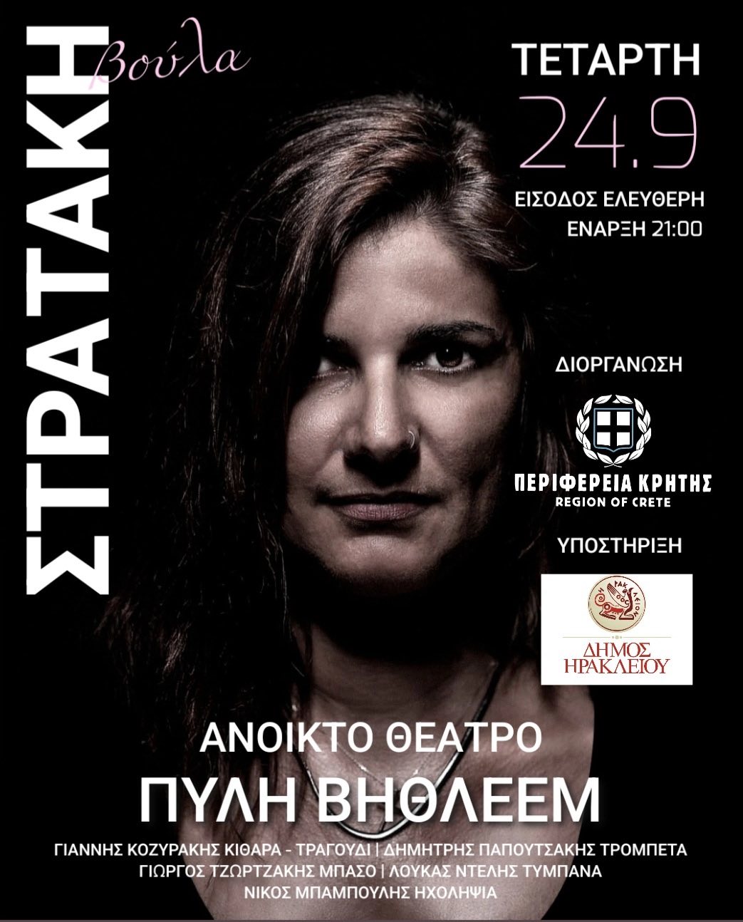 Η Περιφέρεια Κρήτης, σε συνεργασία με τον Δήμο Ηρακλείου, παρουσιάζει τη Βούλα Στρατάκη σε μια ξεχωριστή μουσική βραδιά στο Ανοιχτό Θέατρο «Πύλη Βηθλεέμ», την Τετάρτη 24 Σεπτεμβρίου στις 21:00.