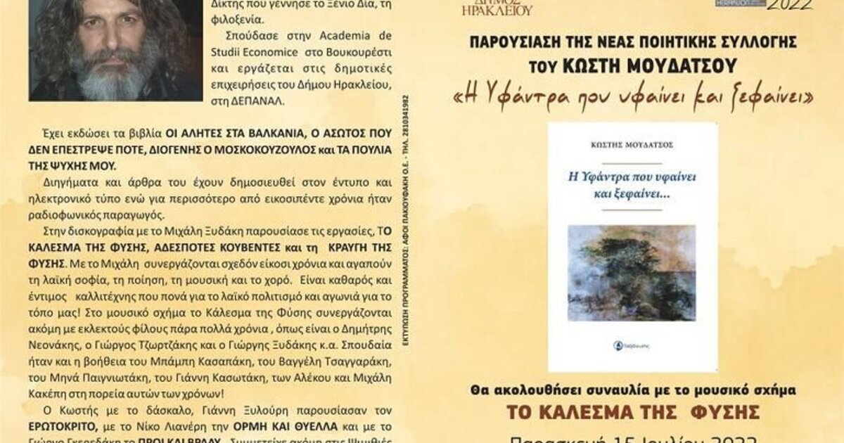 Παρουσίαση Ποιητικής Συλλογής / Συναυλία: «Η ΥΦΑΝΤΡΑ ΠΟΥ ΥΦΑΙΝΕΙ ΚΑΙ ΞΕΦΑΙΝΕΙ», η νέα ποιητική συλλογή του Κωστή Μουδάτσου