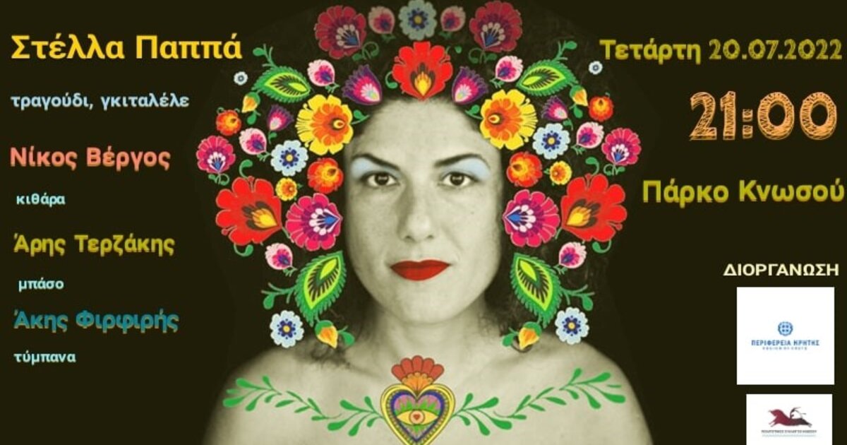 Η εκδήλωση, με την στήριξη της Περιφέρειας Κρήτης, θα γίνει αύριο Τετάρτη 20 Ιουλίου στις 9 το βράδυ στο πάρκο Κνωσού (δίπλα στις αρχαιότητες Κνωσού) με ελεύθερη είσοδο.