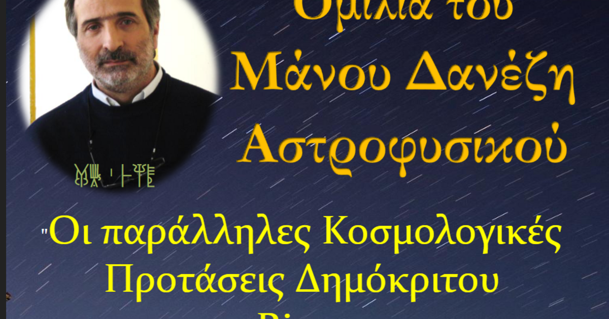 Το θέμα τις ομιλίας θα είναι:«Οι Παράλληλες Κοσμολογικές Προτάσεις Δημόκριτου και Riemann».