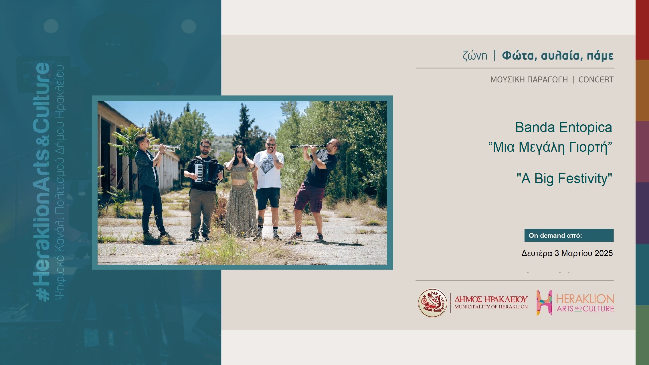 Η συναυλία με τους Banda Entopica που είχε παρουσιαστεί στο πλαίσιο του Φεστιβάλ των Τειχών, τον Σεπτέμβριο του 2024 στην Πλατεία Προμαχώνα Ιησού από σήμερα θα είναι διαθέσιμη στο διαδικτυακό κανάλι πολιτισμού του Δήμου Ηρακλείου. Η On line πρεμιέρα θα πραγματοποιηθεί στις 20:00 στον παρακάτω σύνδεσμο: https://youtu.be/YxYtbOhbt64 και έπειτα θα παραμείνει διαθέσιμη on demand για το κοινό.