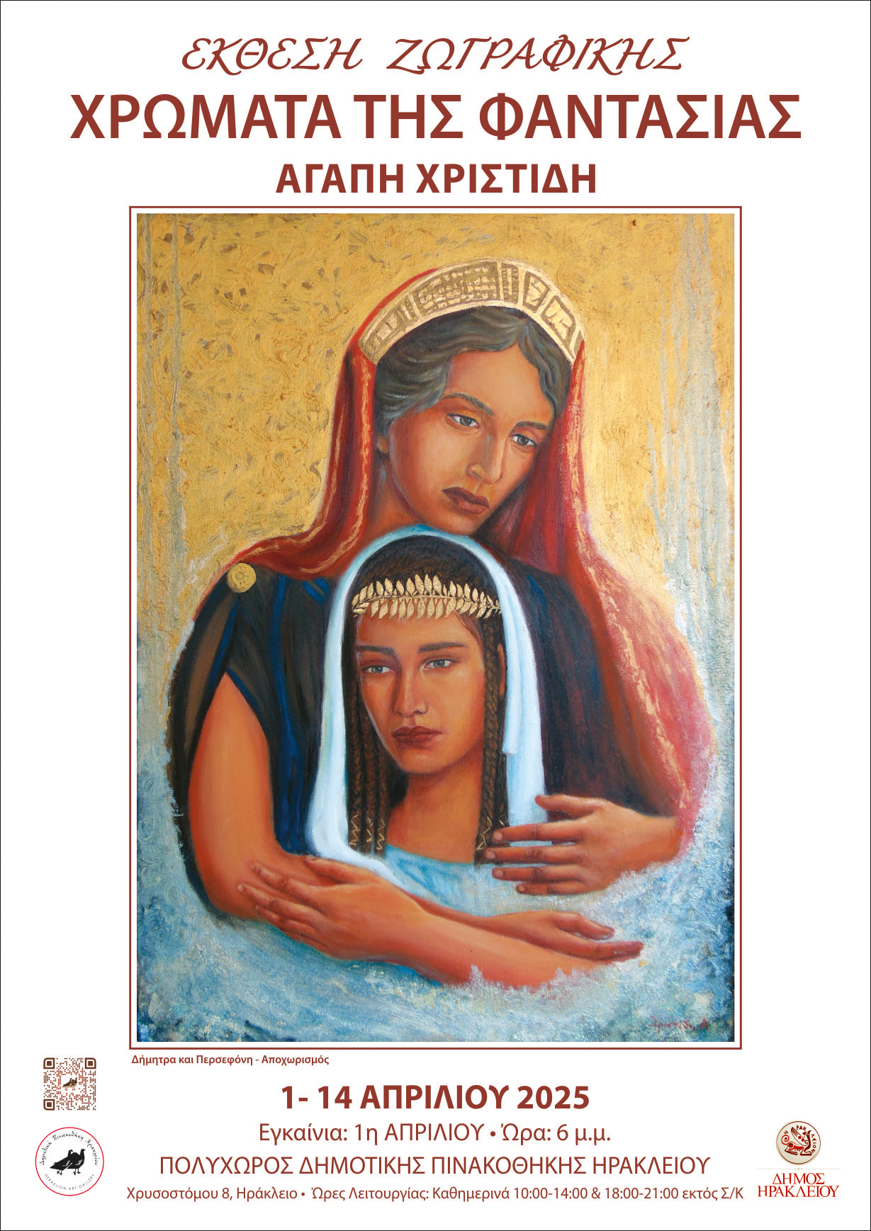 H έκθεση ζωγραφικής της Αγάπης Χριστίδη συνεχίζεται μέχρι και την Μ. Δευτέρα 16 Απριλίου 2025 στην Gallery του Πολυχώρου της Δημοτικής Πινακοθήκης Ηρακλείου με τίτλο «Χρώματα της Φαντασίας». Εκθέτονται 28 πίνακες η θεματολογία των οποίων περιλαμβάνει προσωπογραφίες οι οποίες δεν είναι απλά κάποια πορτραίτα, αλλά εκφράζουν μέσα από διάφορες καταστάσεις μία ποικιλία ανθρωπίνων συναισθημάτων. Ανάμεσα τους υπάρχουν τοπία και χαρακτηριστικά μέρη της Κρήτης καθώς και δύο αγιογραφίες από τις οποίες η μία αποτυπώνει αλληγορικά κάποιο γνωστό θρησκευτικό γεγονός. Επίσης υπάρχουν και έργα που παρουσιάζονται με ιδιόμορφο τρόπο και έχουν οικολογικές προεκτάσεις.
