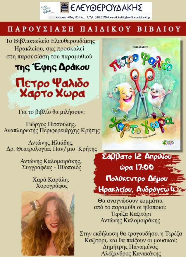 Το Βιβλιοπωλείο Ελευθερουδάκης Ηρακλείου, σας προσκαλεί στη παρουσίαση του παραμυθιού της Έφης Δράκου, ΠετροΨαλιδοΧαρτοΧώρα!