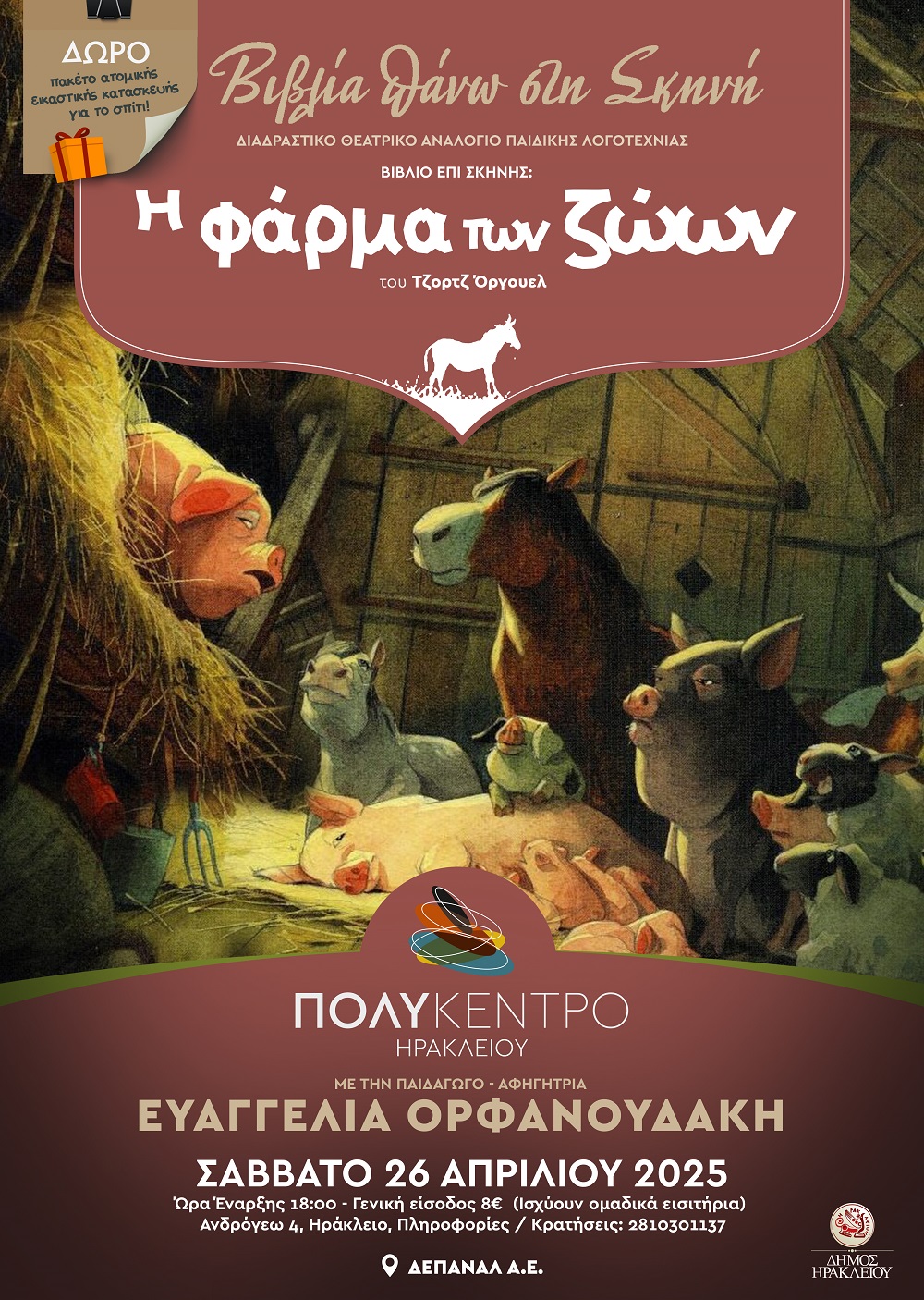 Πολύκεντρο Δήμου Ηρακλείου (Ανδρόγεω 4). Ώρα έναρξης: 18:00 – Γενική είσοδος: 8€ / άτομο * ισχύουν ομαδικά εισιτήρια. Για περισσότερες πληροφορίες και κρατήσεις 2810301137