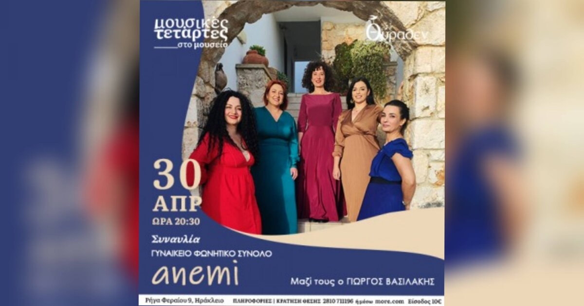 Το γυναικείο φωνητικό σύνολο Anemi την Τετάρτη 30/04/2025 και ώρα 20:30 στο Μουσείο "Θύραθεν" θα τραγουδήσουν acapella παραδοσιακά τραγούδια από πολλές περιοχές για μία ακόμη εκπαιδευτική συναυλία.