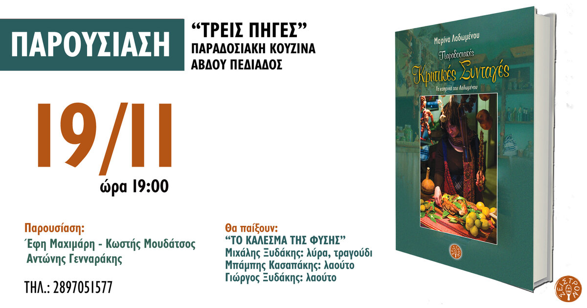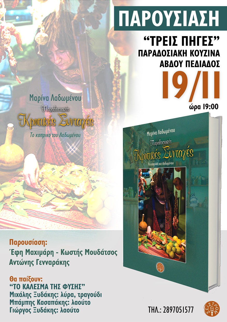 Το Σάββατο 19 Νοεμβρίου 2022 και ώρα 19.00 στο Αβδού και στις ΤΡΕΙΣ ΠΗΓΕΣ παρουσιάζεται το βιβλίο με τις παραδοσιακές Κρητικές Συνταγές της Μαρίνας Λαδωμένου από τις εκδόσεις ΣΕΙΣΤΡΟΝ, σε επιμέλεια του Κωστή Μουδάτσου.