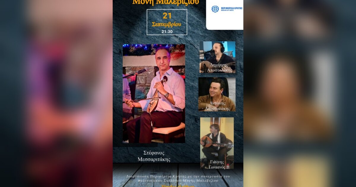 Παραδοσιακή μουσική βραδιά με την στήριξη της Περιφέρειας Κρήτης και ελεύθερη είσοδο για τους πολίτες θα πραγματοποιηθεί το Σάββατο 21 Σεπτεμβρίου στην Μονή Μαλεβιζίου στη πλατεία του χωριού με ώρα έναρξης 21.30 μ.μ.
