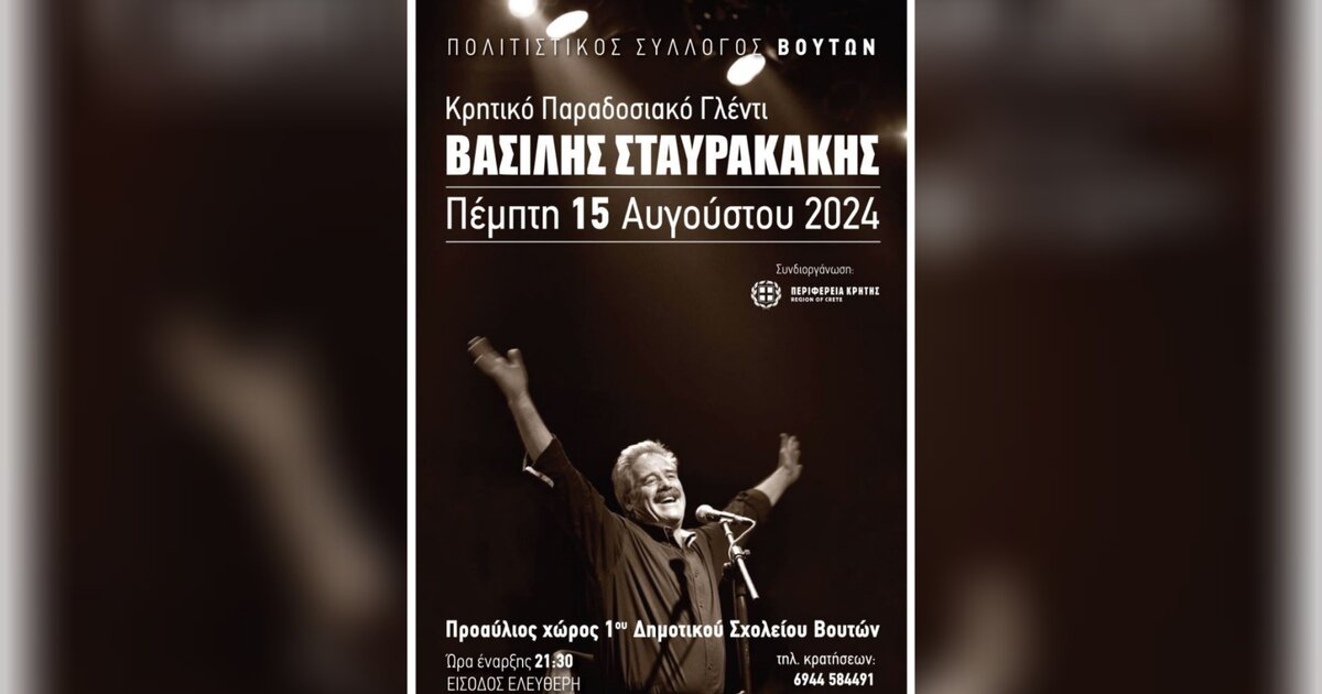 Την Πέμπτη 15 Αυγούστου 2024 και ώρα 9:30 μ.μ θα πραγματοποιηθεί στις Βούτες Ηρακλείου παραδοσιακό κρητικό γλέντι ενόψει της εορτής της Κοιμήσεως Θεοτόκου Ενορίας Βουτών με το συγκρότημα του Βασίλη Σταυρακάκη. Ο Πολιτιστικός Σύλλογος Βουτών, με την συνδιοργάνωση της Περιφέρειας Κρήτης, προσκαλεί τους πολίτες στον προαύλιο χώρο του 1ου Δημοτικού Σχολείου Βουτών (εντός χωριού) με ελεύθερη είσοδο για ένα κρητικό γλέντι με πολύ κέφι και όρεξη.