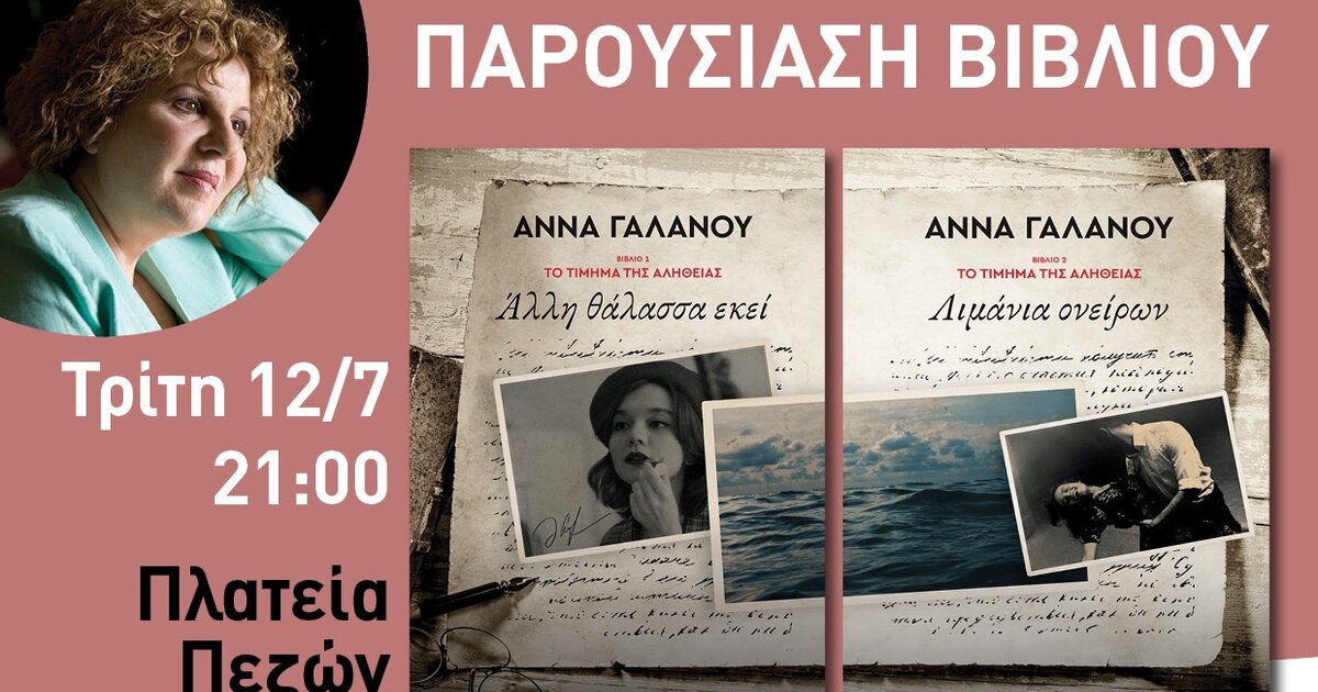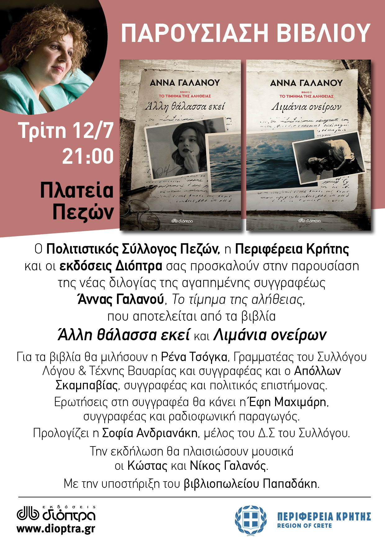 Ο Πολιτιστικός Σύλλογος Πεζών και οι εκδόσεις Διόπτρα με την στήριξη της Περιφέρειας Κρήτης, αύριο Τρίτη 12 Ιουλίου 2022 και ώρα 21:00 στην πλατεία Πεζών παρουσιάζουν τη νέα διλογία της συγγραφέως Άννα Γαλανού. Θα ακολουθήσουν ομιλίες από συνεργάτες της κυρίας Γαλανού και παρουσίαση από μέλη του Πολιτιστικού Συλλόγου Πεζών. Την εκδήλωση θα παλαιώσουν μουσικά οι Κώστας & Νίκος Γαλανός.