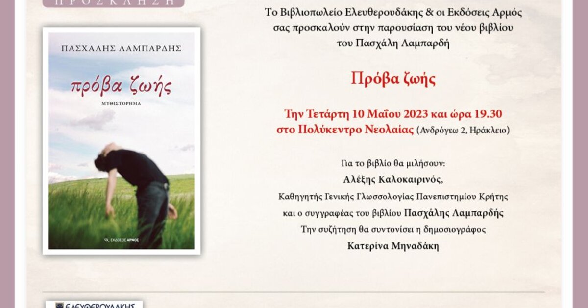 Tο Βιβλιοπωλείο Ελευθερουδάκης & οι Εκδόσεις Αρμός σας προσκαλούν στην παρουσίαση του βιβλίου του Πασχάλη Λαμπαρδή «Πρόβα ζωής» την Τετάρτη 10 Μαΐου 2023 και ώρα 19.30 στο Πολύκεντρο Νεολαίας (Ανδρόγεω 2, Ηράκλειο).