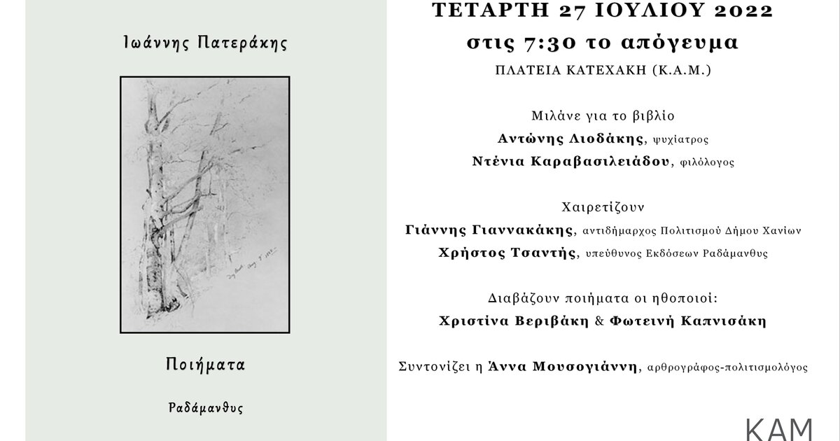 Η ΚΕΠΠΕΔΗΧ-ΚΑΜ, ο Δήμος Χανίων και οι Εκδόσεις Ραδάμανθυς παρουσιάζουν την ποιητική συλλογή του Ιωάννη Πατεράκη, την Τετάρτη 27 Ιουλίου 2022, στις 7:30 το απόγευμα.