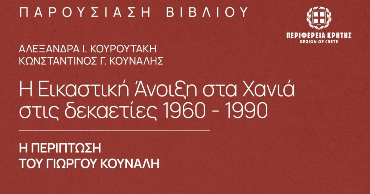 Η Περιφέρεια Κρήτης - Περιφερειακή Ενότητα Χανίων διοργανώνει τη Δευτέρα 25 Σεπτεμβρίου 2023, στο Πνευματικό Κέντρο Χανίων, στις 19:30, την παρουσίαση του βιβλίου της Δρ. Αλεξάνδρας Κουρουτάκη, ιστορικού της τέχνης, μέλους Ε.ΔΙ.Π. του Πολυτεχνείου Κρήτης και του Κωνσταντίνου Κουνάλη, εικαστικού, με τίτλο: