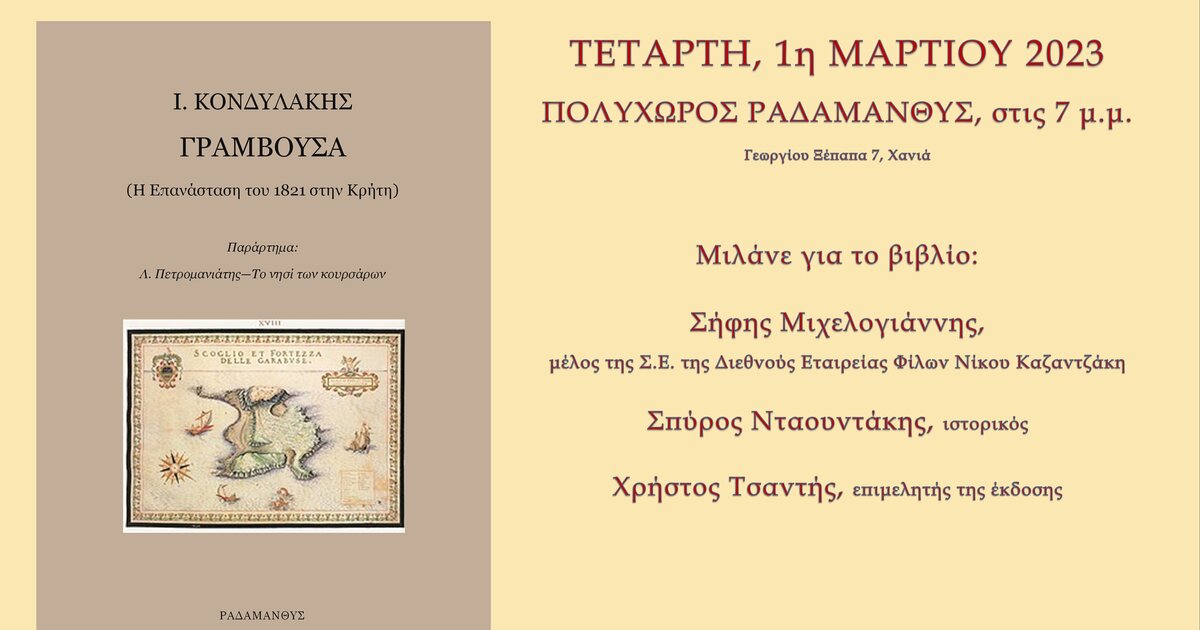 Οι Εκδόσεις Ραδάμανθυς παρουσιάζουν το βιβλίο του Ιωάννη Κονδυλάκη «Γραμβούσα – Η επανάσταση του 1821 στην Κρήτη», την Τετάρτη 1η Μαρτίου, στις 7 μ.μ., στον Πολυχώρο Ραδάμανθυς (Ξέπαπα 7).