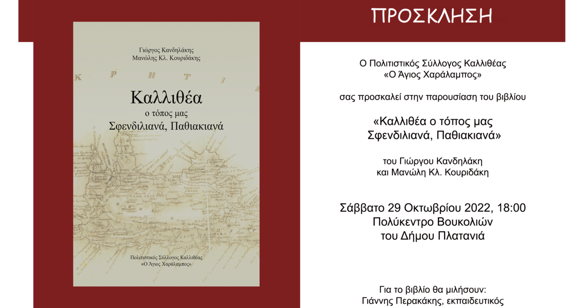 Ο Πολιτιστικός Σύλλογος Καλλιθέας προσκαλεί στην παρουσίαση του Βιβλίου: "Καλλιθέα, ο τόπος μας Σφενδιλιανά, Παθιακιανά" των Γεωργίου Κανδηλάκη και Μανώλη Κλ.Κουριδάκη.