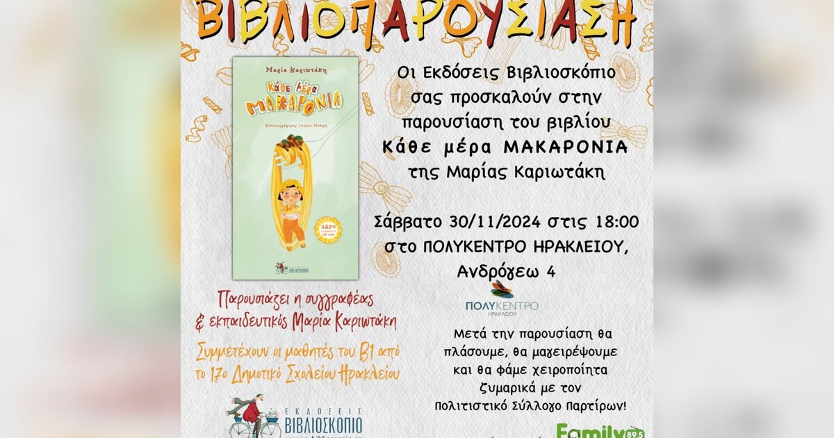 Οι Εκδόσεις Βιβλιοσκόπιο και η συγγραφέας Μαρία Καριωτάκη σας προσκαλούν στην πρώτη παρουσίαση του βιβλίου “Κάθε μέρα μακαρόνια”.