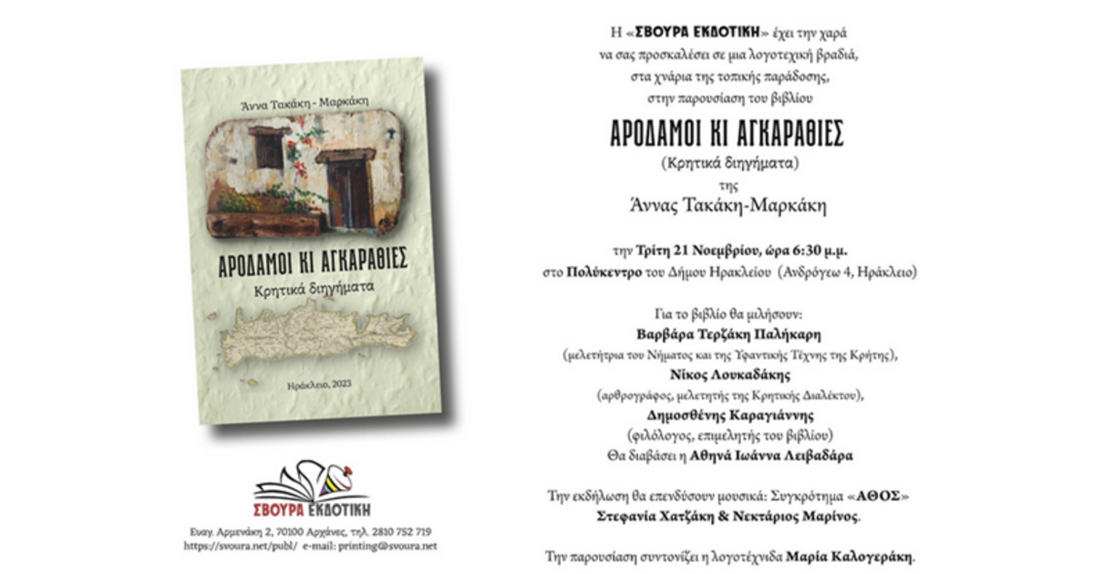 Η «ΣΒΟΥΡΑ ΕΚΔΟΤΙΚΗ» διοργανώνει λογοτεχνική βραδιά, στα χνάρια της τοπικής παράδοσης, με αφορμή την παρουσίαση του βιβλίου "Αροδαμοί κι Αγκαραθιές (Κρητικά διηγήματα)" της Άννας Τακάκη-Μαρκάκη την Τρίτη 21 Νοεμβρίου, ώρα 6:30 μ.μ. στο Πολύκεντρο του Δήμου Ηρακλείου (Ανδρόγεω 4, Ηράκλειο)