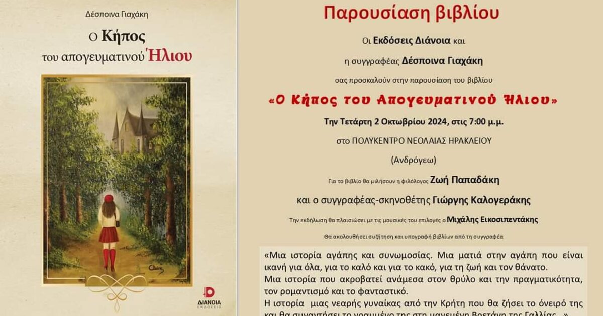 Παρουσιάζεται το βιβλίο “Ο κήπος του απογευματινού Ήλιου” της Δέσποινας Γιαχάκη