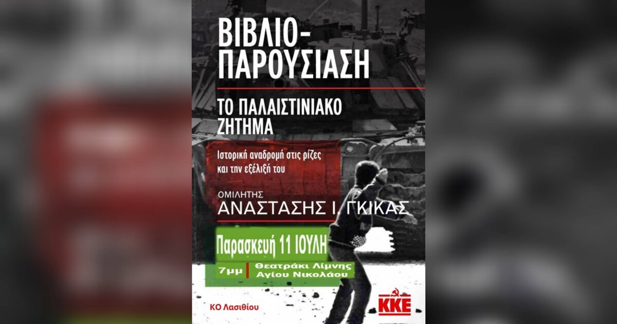 Η Κομματική Οργάνωση Λασιθίου του ΚΚΕ διοργανώνει την Παρασκευή 11 Ιουλίου 2025 στις 19:00, στο Θεατράκι της Λίμνης του Αγίου Νικολάου, εκδήλωση – παρουσίαση του βιβλίου του Αναστάση Γκίκα «Το παλαιστινιακό ζήτημα. Ιστορική αναδρομή στις ρίζες και την εξέλιξή του» με ομιλητή τον Αναστάση Γκίκα, μέλος του Τμήματος Ιστορίας της ΚΕ του ΚΚΕ.