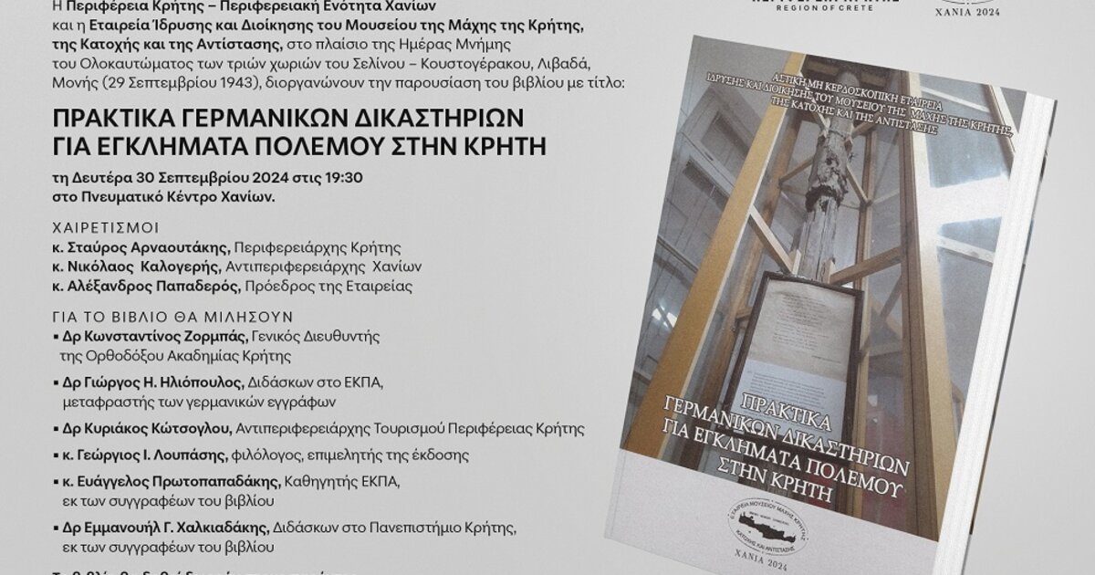 Η Περιφέρεια Κρήτης – Περιφερειακή Ενότητα Χανίων και η Εταιρεία Ίδρυσης και Διοίκησης του Μουσείου της Μάχης της Κρήτης, της Κατοχής και της Αντίστασης, στο πλαίσιο της Ημέρας Μνήμης του Ολοκαυτώματος των τριών χωριών του Σελίνου – Κουστογέρακου, Λιβαδά, Μονής- (29 Σεπτεμβρίου 1943), διοργανώνουν την παρουσίαση του βιβλίου με τίτλο: «Πρακτικά γερμανικών δικαστηρίων για εγκλήματα πολέμου στην Κρήτη» τη Δευτέρα 30 Σεπτεμβρίου 2024, ώρα 19.30, στο Πνευματικό Κέντρο Χανίων.