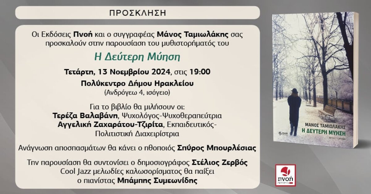 Οι Εκδόσεις Πνοή και ο συγγραφέας Μάνος Ταμιωλάκης σας προσκαλούν στην παρουσίαση του μυθιστορήματος «Η Δεύτερη Μύηση».