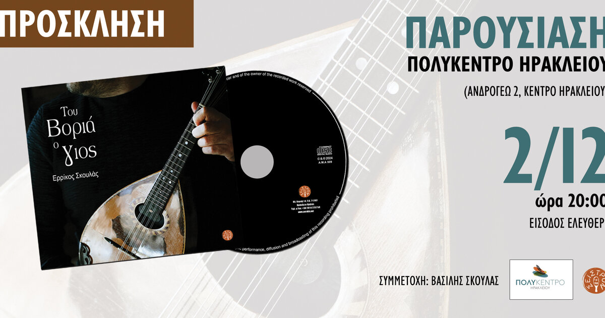 Στο Πολύκεντρο Ηρακλείου (Ανδρόγεω 2, Ηράκλειο) στις 2 Δεκεμβρίου και ώρα 20:00 θα σας παρουσιάσουμε τη πρώτη δισκογραφική δουλειά του Ερρίκου Σκουλά με τίτλο «Του βοριά ο γιος».