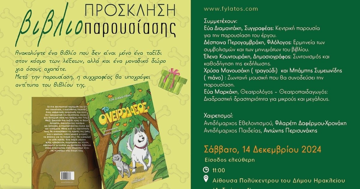 Η συγγραφέας Εύα Διαμαντάκη διοργανώνει την παρουσίαση του νέου της παραμυθιού «Το Ονειρόδασος», που κυκλοφορεί από τις Εκδόσεις Φυλάτος. Η εκδήλωση θα πραγματοποιηθεί το Σάββατο, 14 Δεκεμβρίου 2024, στις 11:00 π.μ., στο Πολύκεντρο Ηρακλείου.
