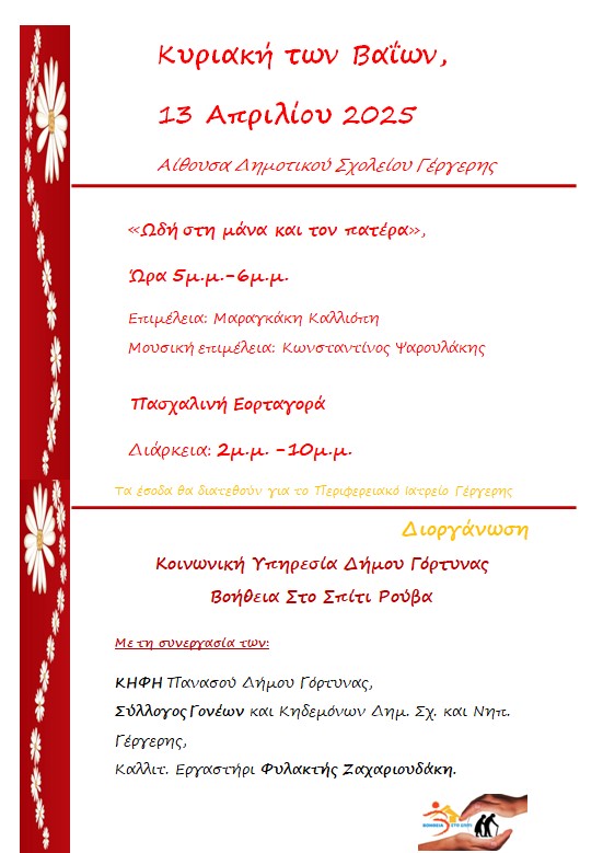 Η Κοινωνική Υπηρεσία και το Βοήθεια στο Σπίτι Ρούβα του Δήμου Γόρτυνας διοργανώνουν πασχαλινή εκδήλωση, την Κυριακή των Βαΐων 13 Απριλίου 2025, στο Δημοτικό Σχολείο Γέργερης.