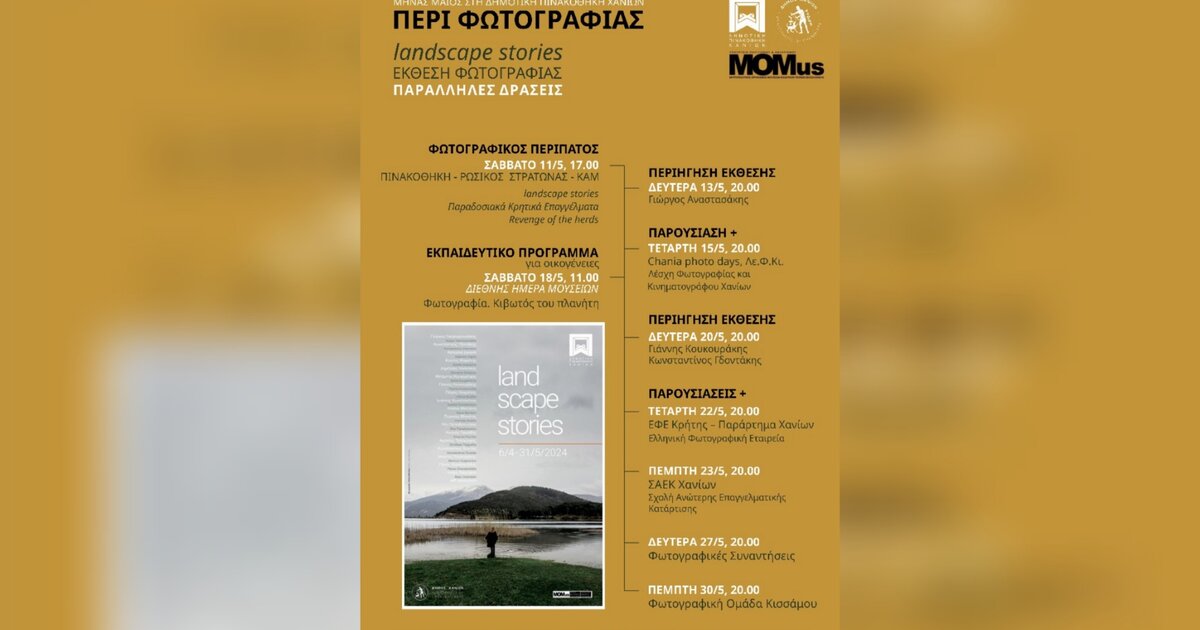 Ο Δήμος Χανίων και η Δημοτική Πινακοθήκη Χανίων σε συνεργασία με το MOMus-Μουσείο Φωτογραφίας Θεσσαλονίκης διοργανώνουν τον μήνα Μάιο σειρά παράλληλων εκδηλώσεων με τίτλο «Περί Φωτογραφίας» στο πλαίσιο της έκθεσης φωτογραφίας «landscape stories», την επιμέλεια της οποίας έχει ο Ηρακλής Παπαϊωάννου.