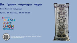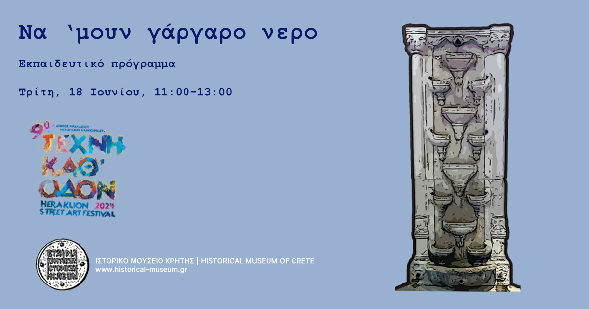 10:00 -12:30 Εκπαιδευτικό πρόγραμμα «Να ‘μουν γάργαρο νερό» με θέμα την ύδρευση της πόλης του Ηρακλείου από την Ενετική περίοδο ως σήμερα. Ξεκινώντας από τις κρήνες και τα πηγάδια θα κάνουμε έναν περίπατο στην ιστορία της ύδρευσης της πόλης. Μέσα από τον πειραματισμό, θα γνωρίσουμε τον κύκλο του νερού, θα μάθουμε πώς έρχεται το νερό στην πόλη στο πέρασμα των χρόνων και θα ανακαλύψουμε τρόπους για να προστατεύουμε και να διαφυλάσσουμε τους υδάτινους πόρους.