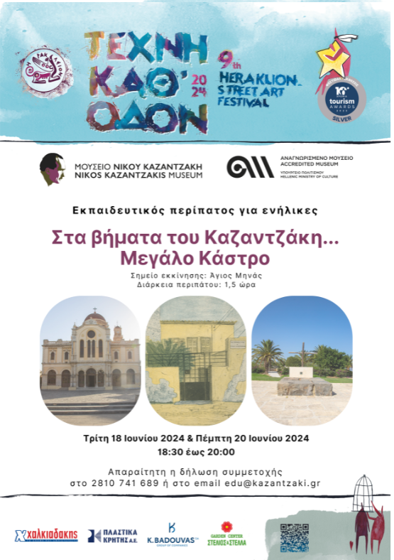 Πώς ήταν το Μεγάλο Κάστρο του Νίκου Καζαντζάκη; Πού βρισκόταν η γειτονιά του και πώς ήταν η ζωή στην πόλη του Ηρακλείου; Μέσα από τον εκπαιδευτικό περίπατο «Στα Βήματα του Καζαντζάκη… Μεγάλο Κάστρο» θα περιηγηθούμε, κάνοντας ένα ταξίδι στον χρόνο, στην πόλη που γεννήθηκε και μεγάλωσε ο οικουμενικός συγγραφέας. Θα ακολουθήσουμε μία διαδρομή που περιλαμβάνει σημεία της πόλης τα οποία περιγράφει ο Νίκος Καζαντζάκης στα μυθιστορήματά του και θα τα συνδέσουμε με επιλεγμένα αποσπάσματα από το έργο του.