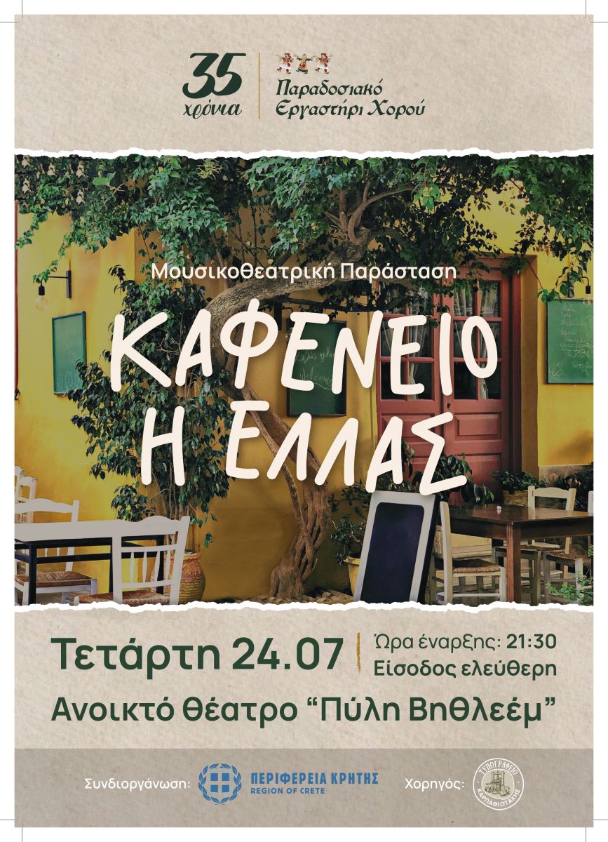 Την Τετάρτη 24 Ιουλίου στις 9.30 μ.μ. παρουσιάζεται η μουσικοθεατρική βραδιά με τίτλο «καφενείο η Ελλάς» - Την Πέμπτη 25 Ιουλίου στις 9.30 μ.μ. παρουσιάζεται η εκδήλωση με τίτλο «η φορεσιά της Κρήτη»