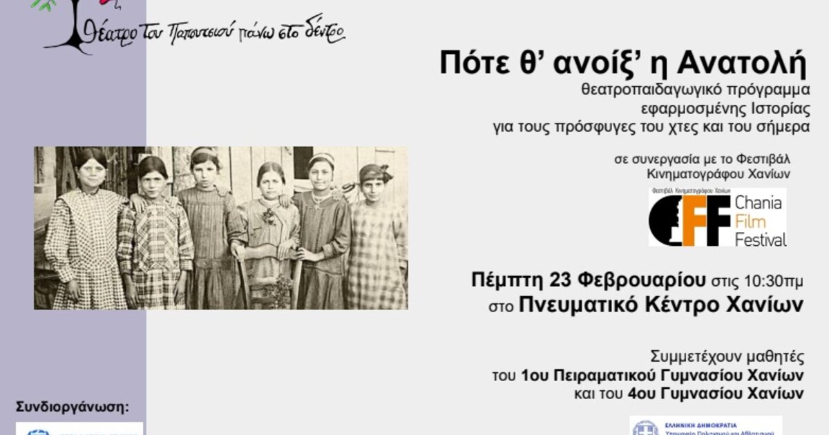 Η Περιφέρεια Κρήτης – Περιφερειακή Ενότητα Χανίων σε συνδιοργάνωση με το «Θέατρο του παπουτσιού πάνω στο δέντρο», σε συνεργασία με το Φεστιβάλ Κινηματογράφου Χανίων, με την υποστήριξη του ΔΗ.ΠΕ.ΘΕ. Κρήτης και υπό την αιγίδα και την οικονομική υποστήριξη του Υπουργείου Πολιτισμού & Αθλητισμού, παρουσιάζει το θεατροπαιδαγωγικό πρόγραμμα εφαρμοσμένης Ιστορίας για τους πρόσφυγες του χτες και του σήμερα: