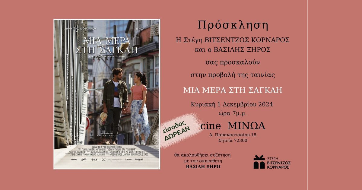 Η Στέγη ΒΙΤΣΕΝΤΖΟΣ ΚΟΡΝΑΡΟΣ και ο ΒΑΣΙΛΗΣ ΞΗΡΟΣ σας προσκαλούν στην προβολή της ταινίας "Μια μέρα στη Σαγκάη", την Κυριακή 1 Δεκεμβρίου 2024 στις 7 μ.μ. στο cine ΜΙΝΩΑ (Παπαναστασίου 18 Σητεία, 72300) ΕΙΣΟΔΟΣ ΔΩΡΕΑΝ