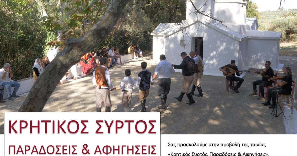 Στο πλαίσιο του Φεστιβάλ Κινηματογράφου Χανίων, την Τρίτη 21 Οκτωβρίου 2025 και ώρα 19:30, θα προβληθεί το ντοκιμαντέρ «Κρητικός Συρτός. Παραδόσεις & Αφηγήσεις» στο Βενιζέλειο Ωδείο Χανίων.